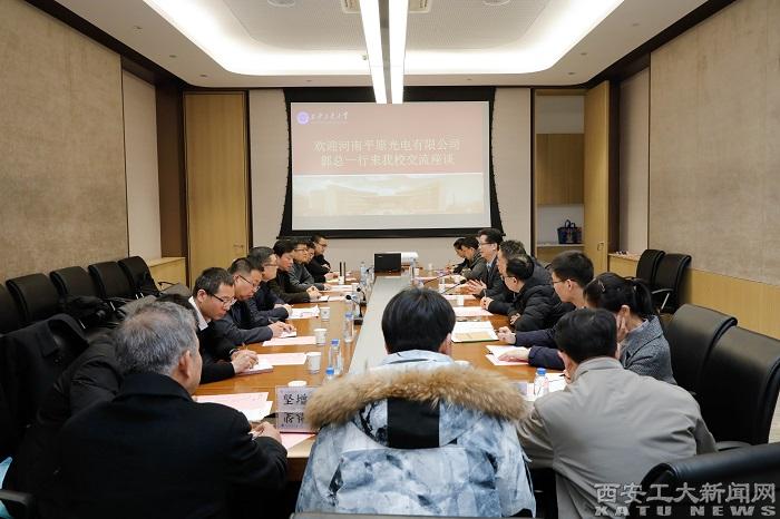 (本网讯)近日,河南平原光电有限公司董事长郭海星、总经理张亚东一行莅临米乐(中国)一站式服务平台座谈交流,党委书记刘卫国、副校长陈建出席座谈会,会议由陈建主持。
