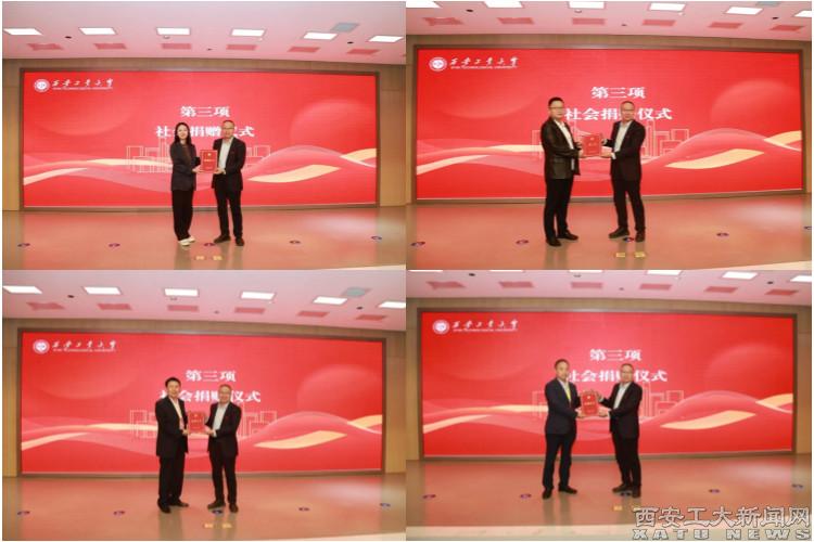 陕西华森盛邦科技有限公司董事长翁婧、北京鑫宏诚建设工程有限公司副总经理赵德旺、陕西鸿天科技成果转化有限公司总经理刘鸿、西安航星物联网信息技术服务有限公司董事长郭景峰等企业家向学校慷慨捐赠。何春水代表学校接受捐赠并颁发证书。