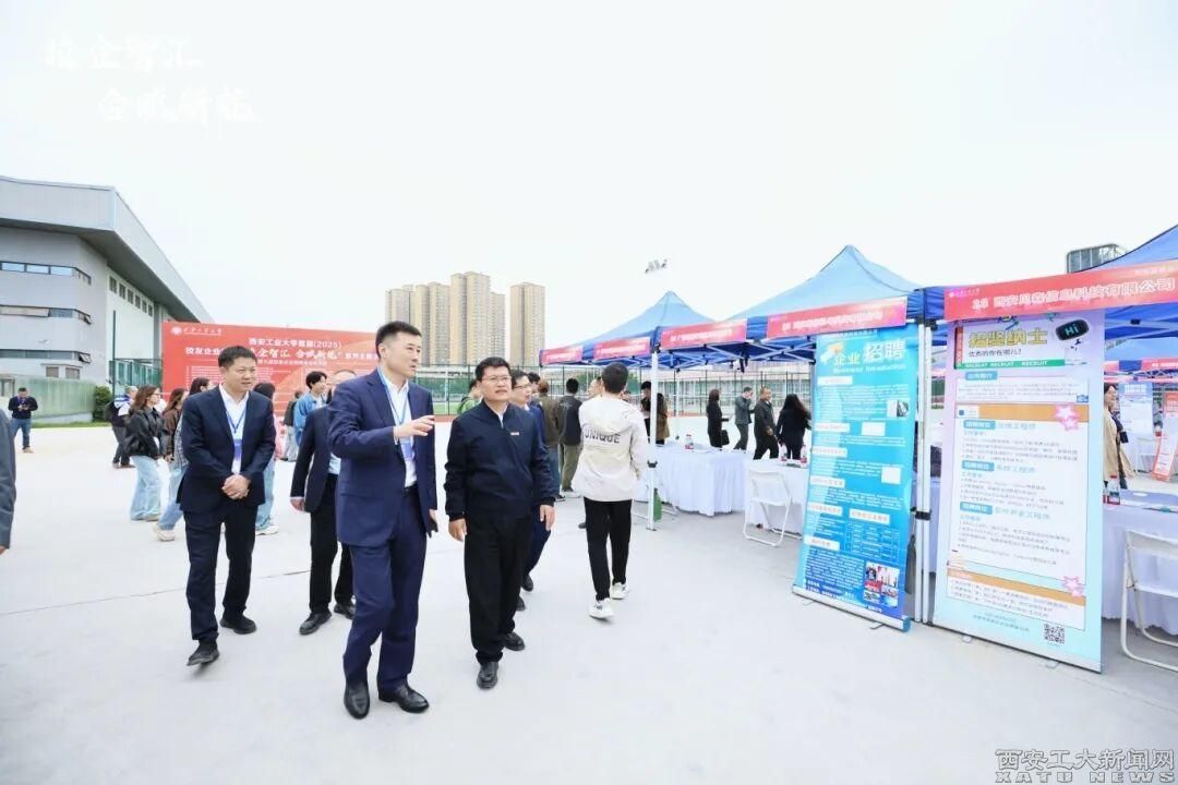 校领导一行走访了各招聘展位,与校友企业代表深入交流人才需求,并询问在场毕业生求职情况。