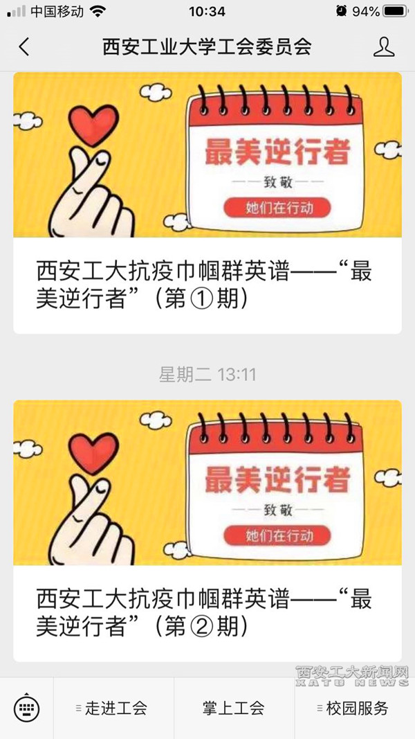 为弘扬抗疫期间“逆行者”无私奉献和勇于担当的大无畏精神,凝聚众志成城、共克时艰的强大正能量,校工会在工会微信公众平台上推出了“西安工大抗疫巾帼群英谱”专栏,分四期对推选出的35名“最美逆行者”先进事迹进行宣传,让这些巾帼玫瑰们在米乐平台绽放光彩,让她们的事迹激励我们每一个米乐平台人不断前行。