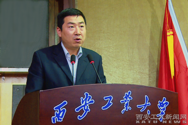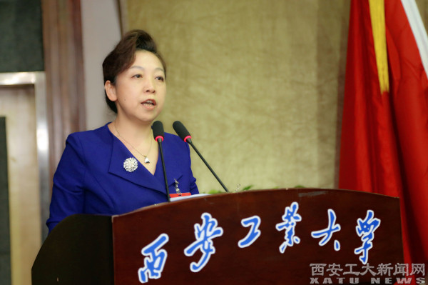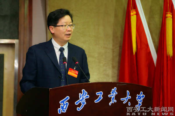陕西省教科文卫体工会副主席陈鹏致辞。陈鹏指出,双代会是学校发展中的大事,是全校教职工政治生活中的喜事。近几年来,米乐平台工会在民主管理、民主监督、维护教职工合法权益、丰富教职工文化生活等方面成绩显著,希望学校党委一如既往地支持工会工作。对于今后工会工作,陈鹏提出了意见和建议。