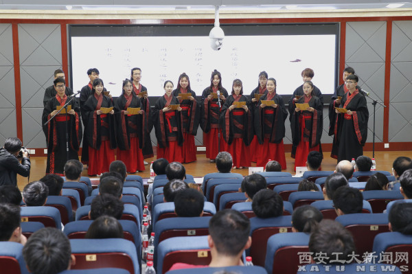 整场仪式分经、史、子、集四个部分。在《梦•未央》《西影及西部电影宣传片》视频展示中,仪式拉开帷幕。人文学院带来的汉服诵读《蒹葭》节目,穿越古今诵秦风,震撼全场。室雅人和氛围中,学生抚琴、教师茶道演绎。中国书法学院教授挥毫泼墨,书写甲子芳华。于孟晨等人朗诵的《面朝大海春暖花开》,更是将活动现场氛围推向了高潮。