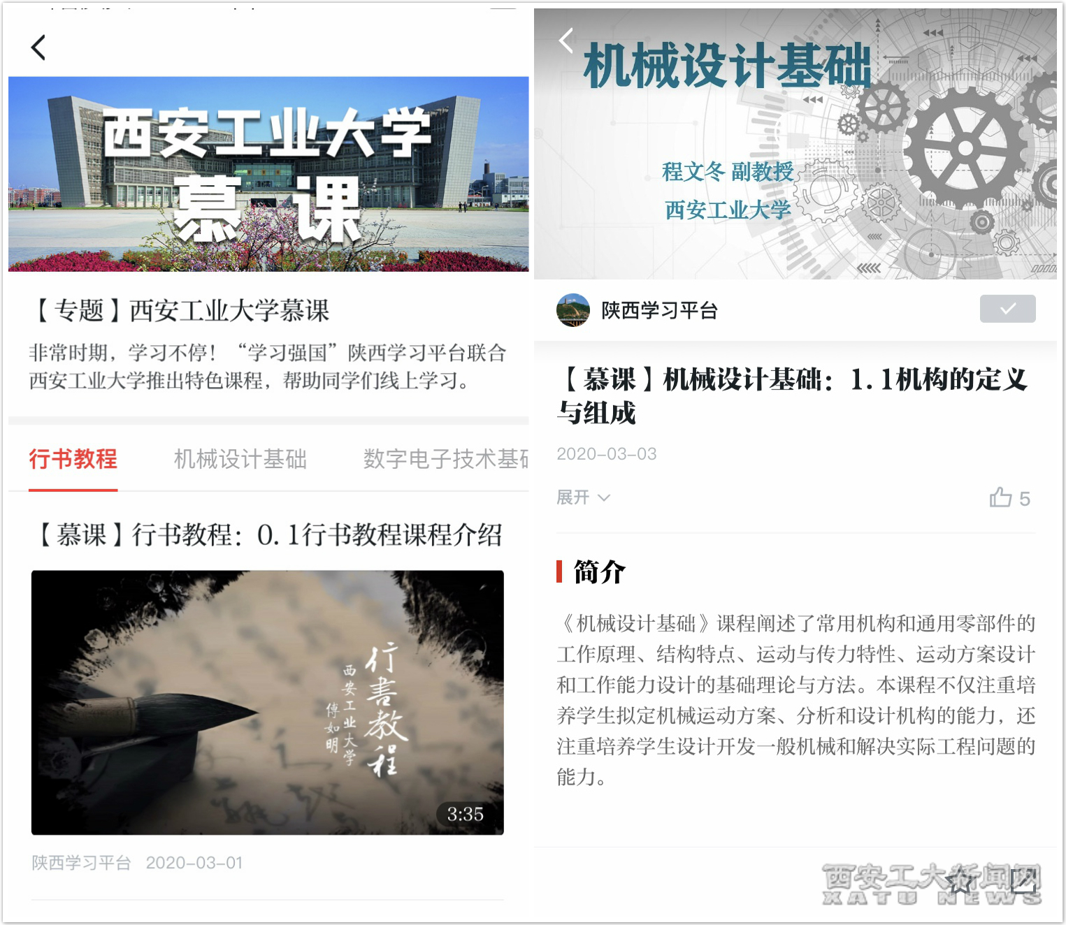 (本网讯)非常时期,学习不停。新冠肺炎疫情期间,米乐平台积极向学习强国信息平台推荐精品慕课资源。目前,米乐平台已有《行书教程》《机械设计基础》《数字电子技术基础》《微机原理及接口技术》《创新创业学》《中国古典园林造园艺术》《线性代数》《工程材料学》《电工电子技术》共9门优质慕课资源在学习强国陕西学习平台上线,成为学习强国陕西学习平台“战疫情”优质大学慕课资源。