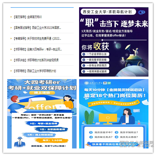 充分挖掘各类就业指导“云资源”,持续推进全程化就业指导教育。云端课程送指导。开通生涯教育一体化平台,提供职业测评、职业规划和就业指导“云课堂”;设立“就业自修室”,提供公务员考试、教师资格考试、事业单位考试等7门公职类招考免费培训课程。分类训练助提升。开展金牌简历特训、考研er求职+考研双保障训练营、宏志助航能力提升训练营、求职导航训练营等“就业能力加油站”系列活动。榜样驿站促引领。挖掘毕业生求职典型事迹,发挥朋辈引领作用,释放互助成长力量,为学生提供多元化就业指导,保障就业“云指导”不断线。