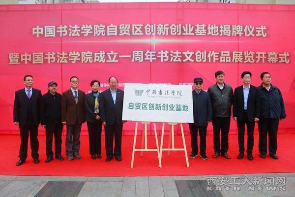 王刚、李德新、董小龙、王建利、刘卫国、杨祎共同为中国书法学院自贸区创新创业基地揭牌。