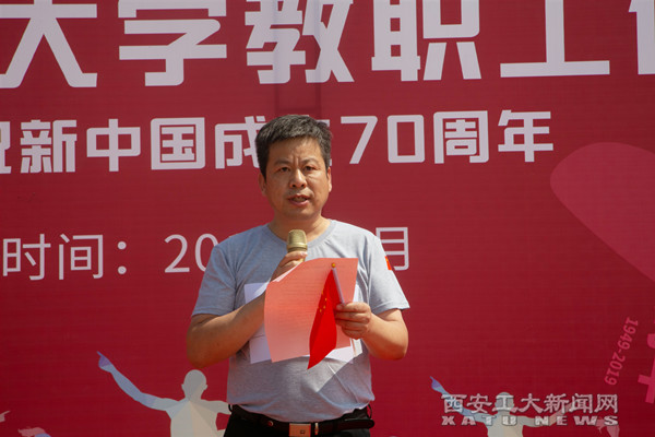党委副书记王军周为活动致辞,他倡议广大教职工要不断升华“爱国、爱校、爱家”情怀,在以习近平新时代中国特色社会主义思想指引下,在校党委的正确领导下,以更加饱满的精神状态投身到学校的教育事业和深化综合改革工作中,以优异的工作成绩献礼中华人民共和国成立70周年。