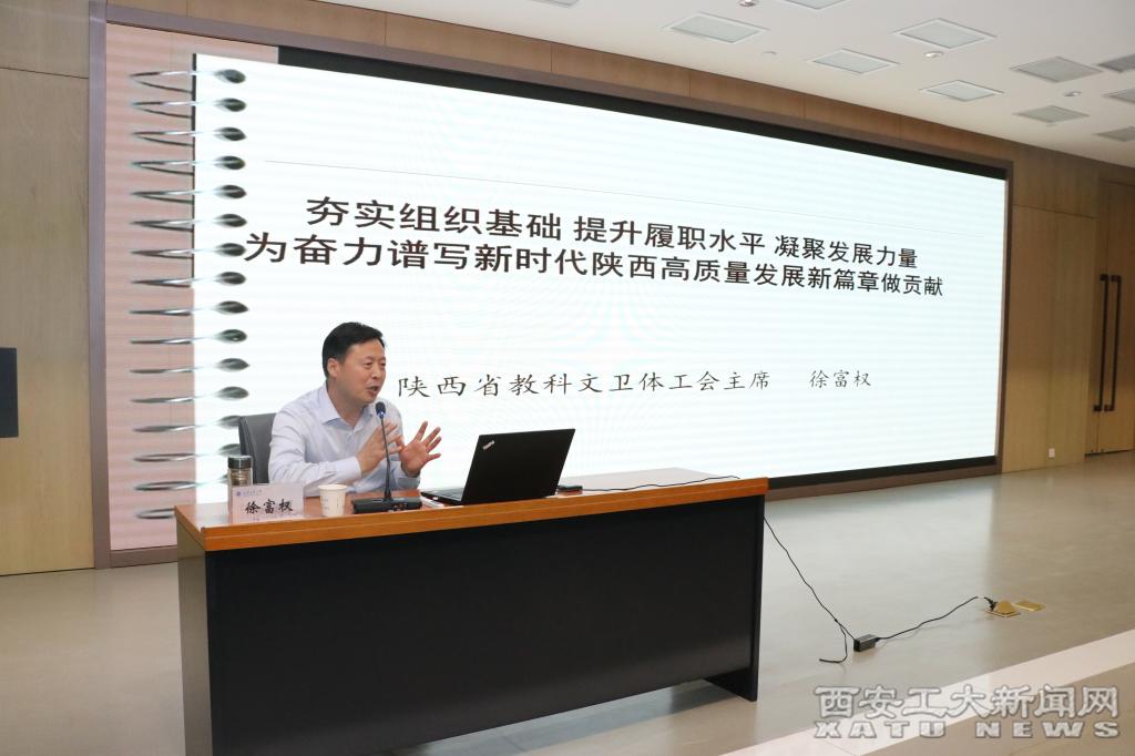 工作会议后进行了工会干部培训,校工会邀请陕西省教科文卫体工会主席徐富权为全体工会专兼职干部作了《夯实组织基础提升履职水平凝聚发展力量为奋力谱写新时代陕西高质量发展新篇章做贡献》的专题报告。他从工会的性质、工会的职能、工会组织、民主管理四方面阐明了工会工作的根本任务和工作方向,激励广大工会干部勇于担当作为,团结带领广大教职工听党话、跟党走,为奋力谱写新时代陕西高质量发展新篇章做贡献!