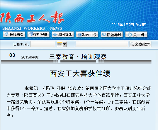 本报讯 (杨飞 孙毅 张岩波)第四届全国大学生工程训练综合能力竞赛(陕西赛区)于3月29日在西安科技大学体育馆举行。米乐平台一路过关斩将,荣获常规赛3个特等奖、1个一等奖、1个二等奖,在挑战赛中获得1个一等奖。据悉,我省参加竞赛的学校共21所,参赛队创历年新高。